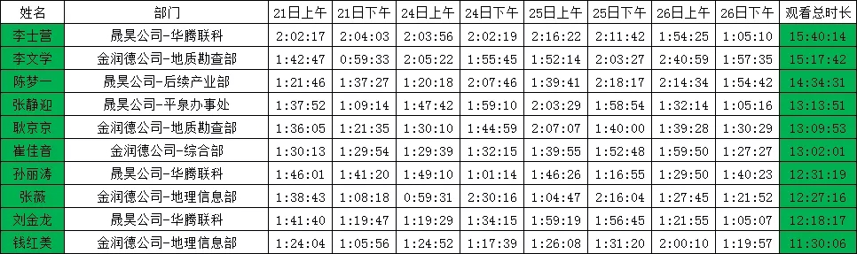 新一周的培训结束了,为进一步提高学习质量,保证线上学习不走形式,集团人力资源部对全体员工2月21-26日的学习时长进行了统计,并查阅了学习笔记,经统计共有李士营、李文学等10名员工学习时间最长最认真,不仅参加了在线学习,笔记记录完整,课后还能反复观看回放加以巩固知识。随着员工们的陆续复工,希望大家当工作时间与线上学习时间冲突时,做到工作为主,同时能利用空闲时间观看回放,做到线上学习常态化。